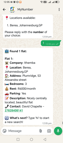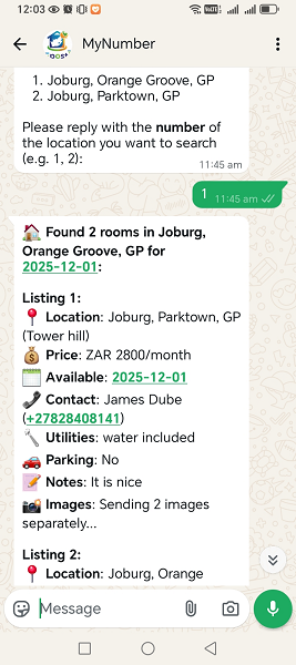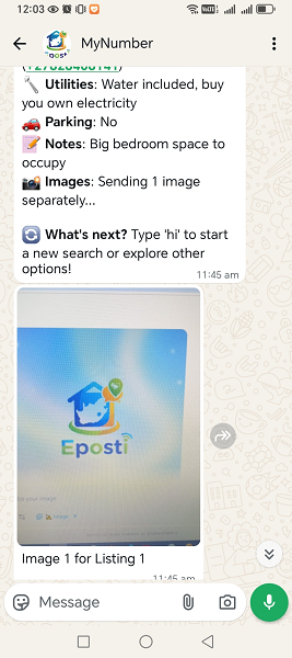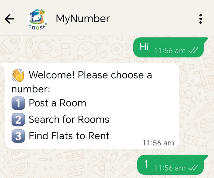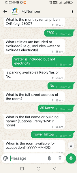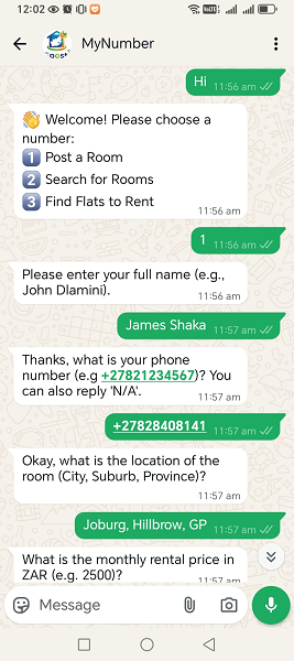 -When the landlord has typed 1, the listing flow starts. Landlord is prompted to enter his full name, next his/her whatsapp phone number,next the location of the room, next the monthly rental of the room,