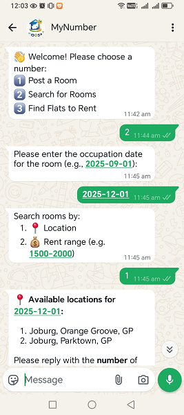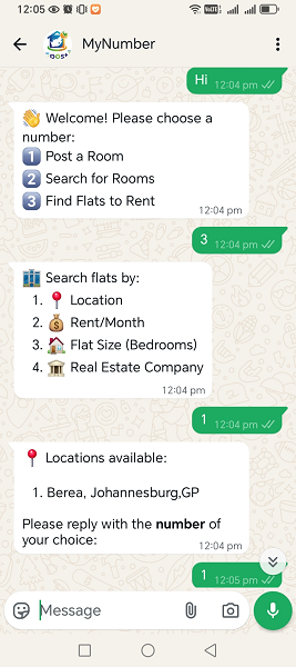 -The Menu above will be diplayed. User has to choose number between 1-3. If the user is a landlord and has a vacant room/s user types 1. If user is a tenant and is looking for a room/s, user types 2. If user is looking for flats/house to rent, user types 3. The response is sent and you wait for the chatbot to reply.