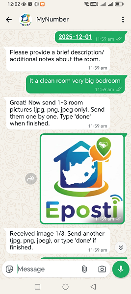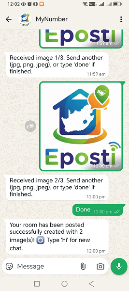-next uplaod at least 1 image of the room and a maximum of 3 about the place, finally type done then uer will get a message to say room has been posted.